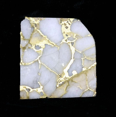 Golden viens (incusions) running throughout the slab (approximately 3mm thickness). This piece is approximately 3×3 inches and is larger than most pieces. XX.XX Grams.